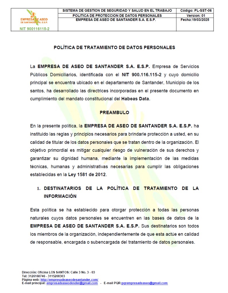 La Empresa de Aseo de Santander S.A E.S.P es la encargada de la prestación del servicio ajusta a las necesidades de la ciudad, representado en un vehículo recolector compactador. Para garantizar un eficiente servicio.